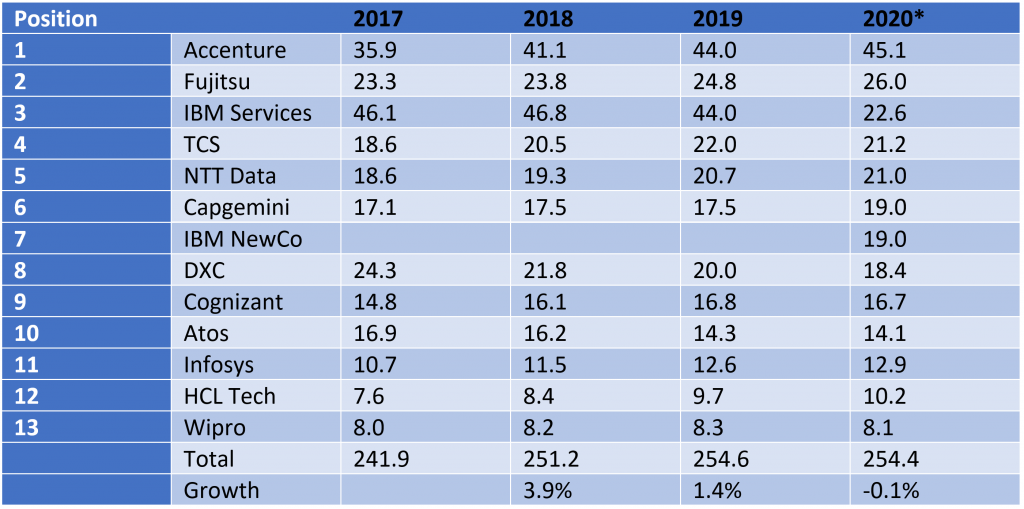Source: Company Financials *2020 estimated from H1 2020 performance so final 2020 revenues may change, particularly if the impact of COVID is less severe than feared. IBM Services Revenue is split between retained IBM and NewCo. The chart shows total revenues or total services revenues so it may include non-IT Services like BPO. Calendar year – quarterly revenue is allocated to the closest calendar year for comparison. This list consists of the leading global IT Service players, excluding pure consulting, specialist regional players like large US government contractors, and the pure BPO providers.