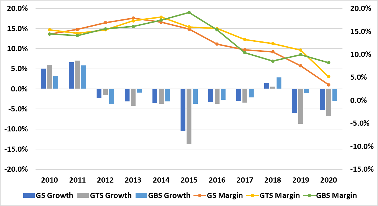 Source: Company Financials *2020 estimated from H1 2020 performance. IBM would be the whole of IBM GS w/o divestiture
