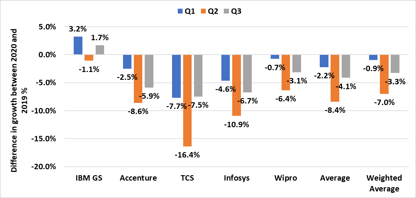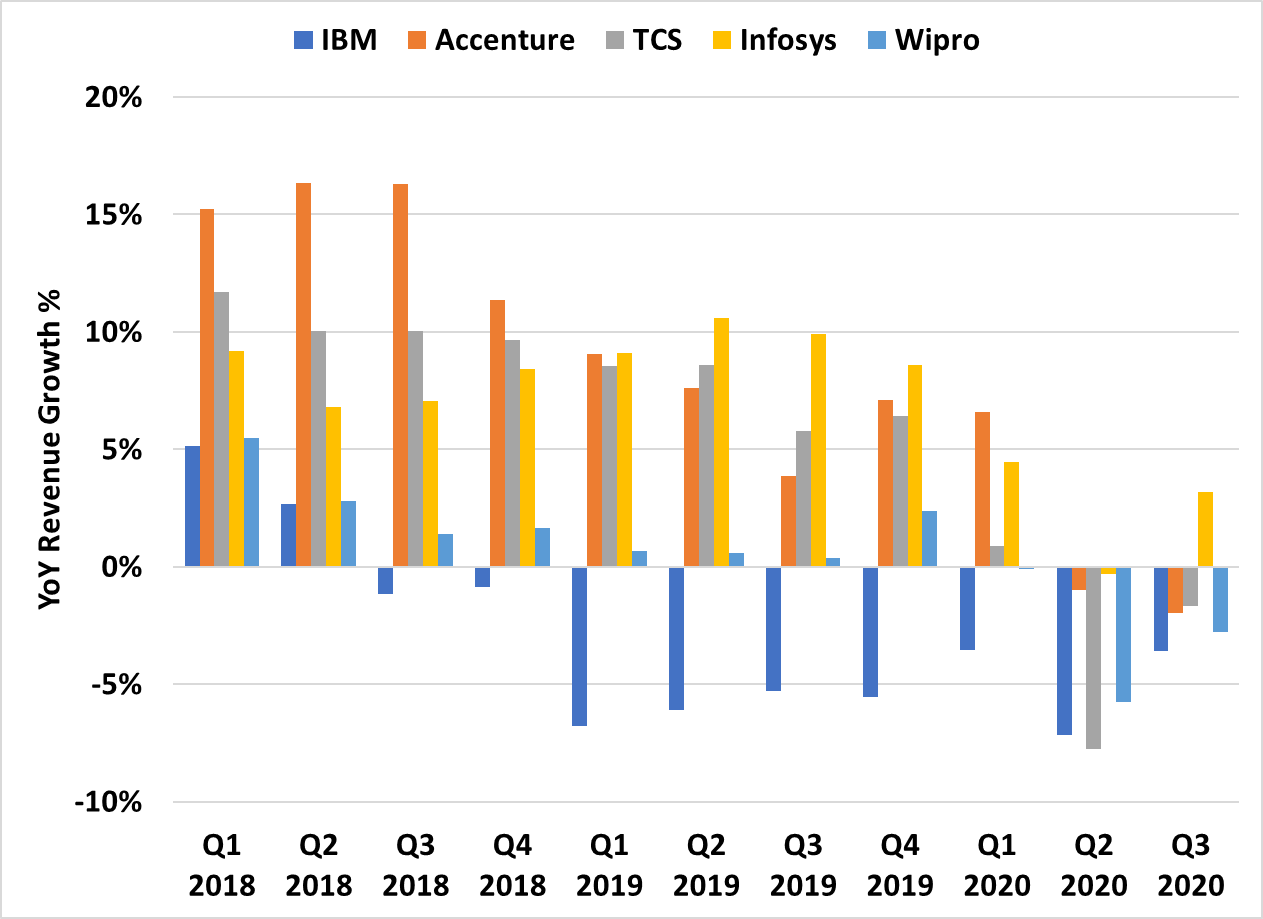 This analysis is based on the financial results of a group of five (Accenture, IBM, TCS, Infosys & Wipro) IT Services companies – we call them the early birds. Because they typically announce their quarterly results first, an analysis of these results can provide an early indication of what the rest of the industry is likely to report for the quarter. Given the impact of COVID on the results, it’s essential to examine these results to see how the IT services industry is impacted overall.