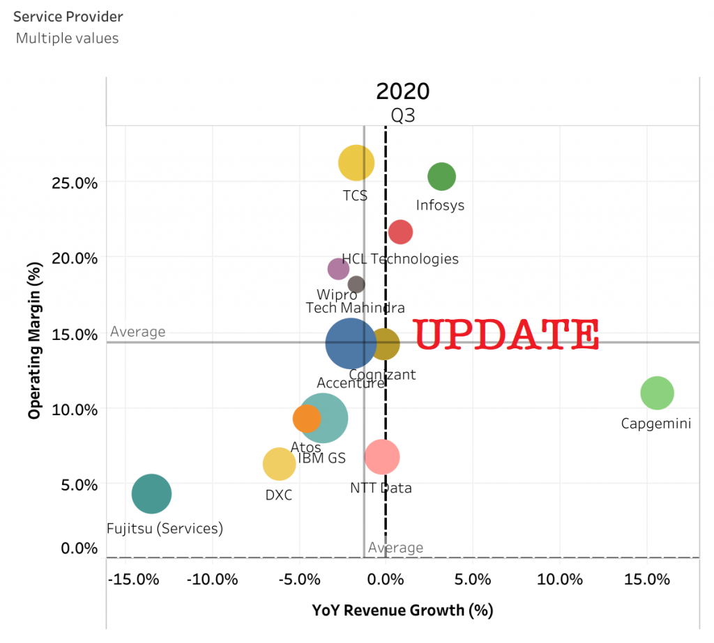 This post updates the Q3 2020 financial performance data with DXC’s figures. Adding this data has changed the position a little – with the bounce in Q3 less pronounced overall.